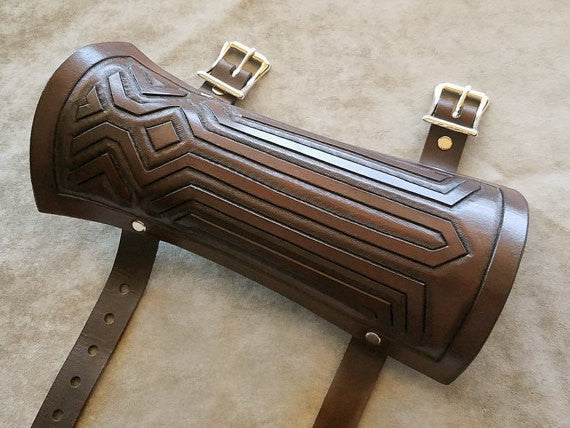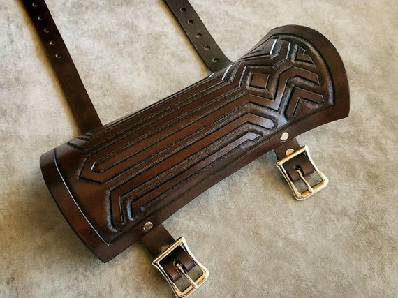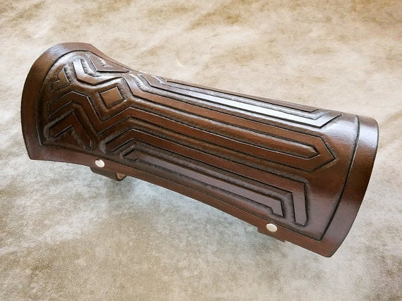 Genuine leather replica of the bracer worn by Link in the upcoming Zelda game, Breath of the Wild. Made of wet-molded 9 oz veg-tan leather, carved and tooled by hand, stained with waterproof oil-based dye.