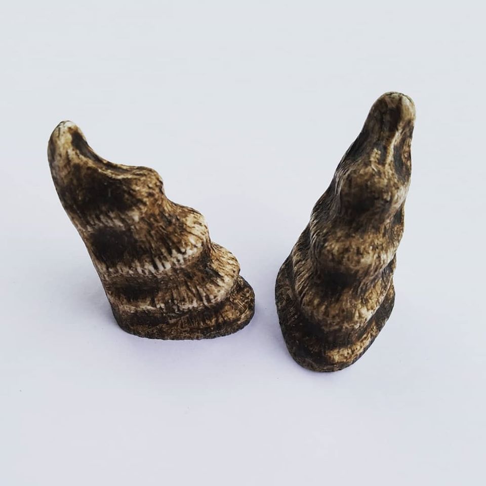 Our Glue-On Horns are sold as a pair and are one size fits all. They are cast in a lightweight resin. We recommend attaching them with spirit gum.