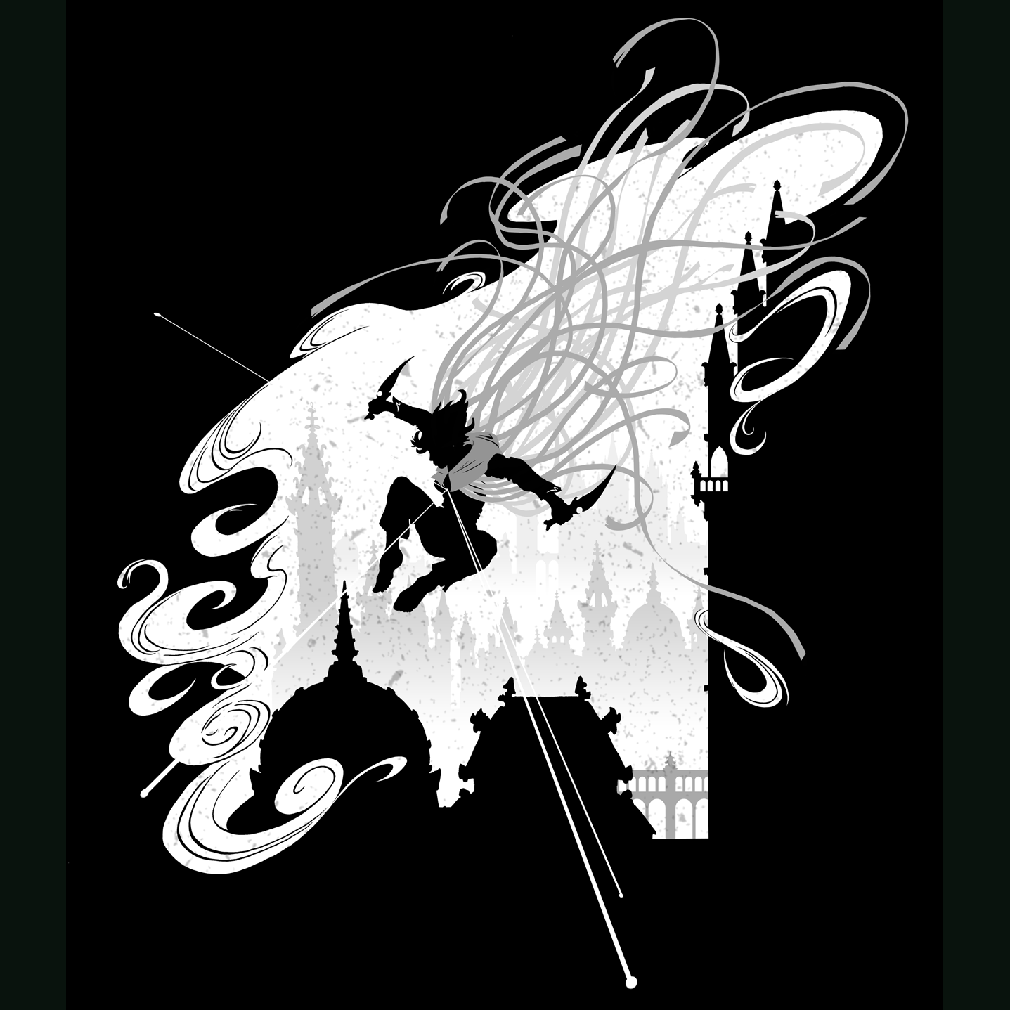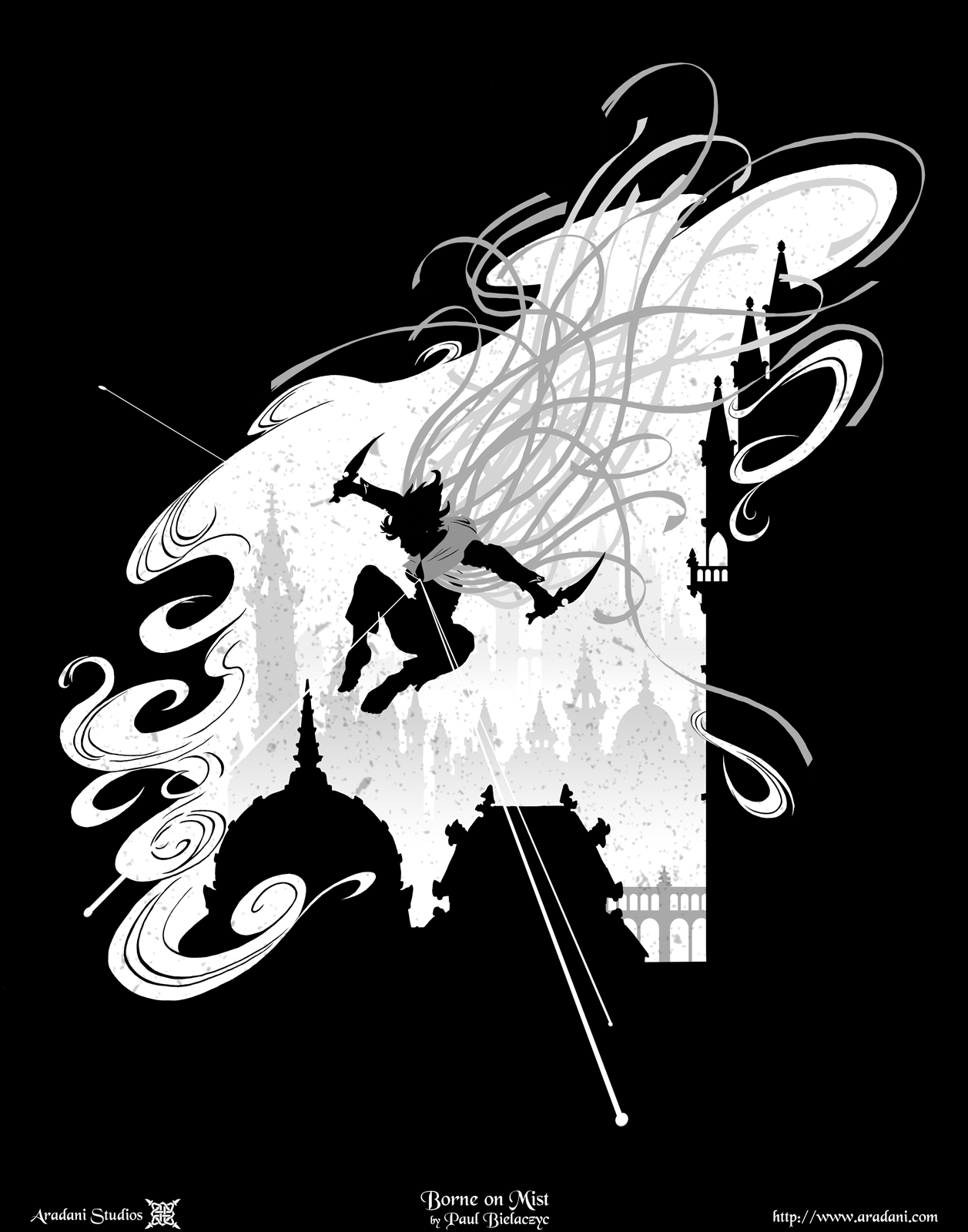 Fan art from Brandon Sanderson's Mistborn series, Borne on Mist features Vin flying over the rooftops of Luthadel. Carrying her trusty daggers, she uses coins to push and pull to fly through the ash filled skies on her next mission to free the people of Scadrial.