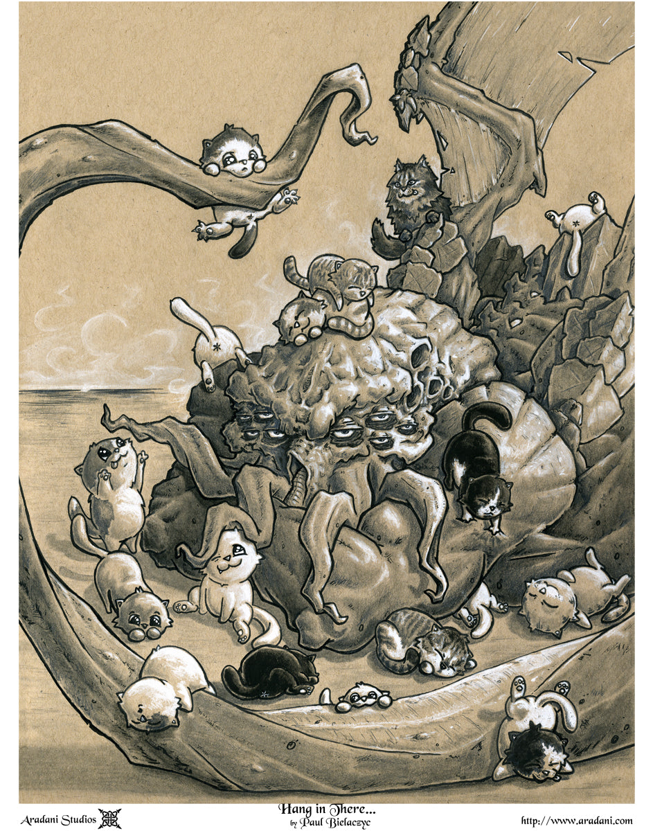 A sequel to my piece Serving the Master, I wanted to draw a very detailed, creepy monster, and tons of cute, chibi kittens. It's kinda like that SNL "More Cowbell" sketch. Serving the Master is great, but what it really needed was more kittens. So many more kittens. So many kittens that the Ancient One Cthulhu really has no choice but to resign himself to his fate, and hopefully just Hang in There...