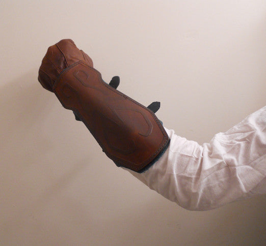 No Hero costume is complete without the bracers that he wore into battle. These bracers are made with 9 ounce Veg Tan leather, giving them a nice thickness. They are fully stained and treated so they are ready for all types of weather. They clasp underneath using a strap and buckle system, so not only are they adjustable, but also much better looking than a simple cord lace-up system. The design was drawn by Paul, and are embossed into the leather. Available in brown with green bracer pads.