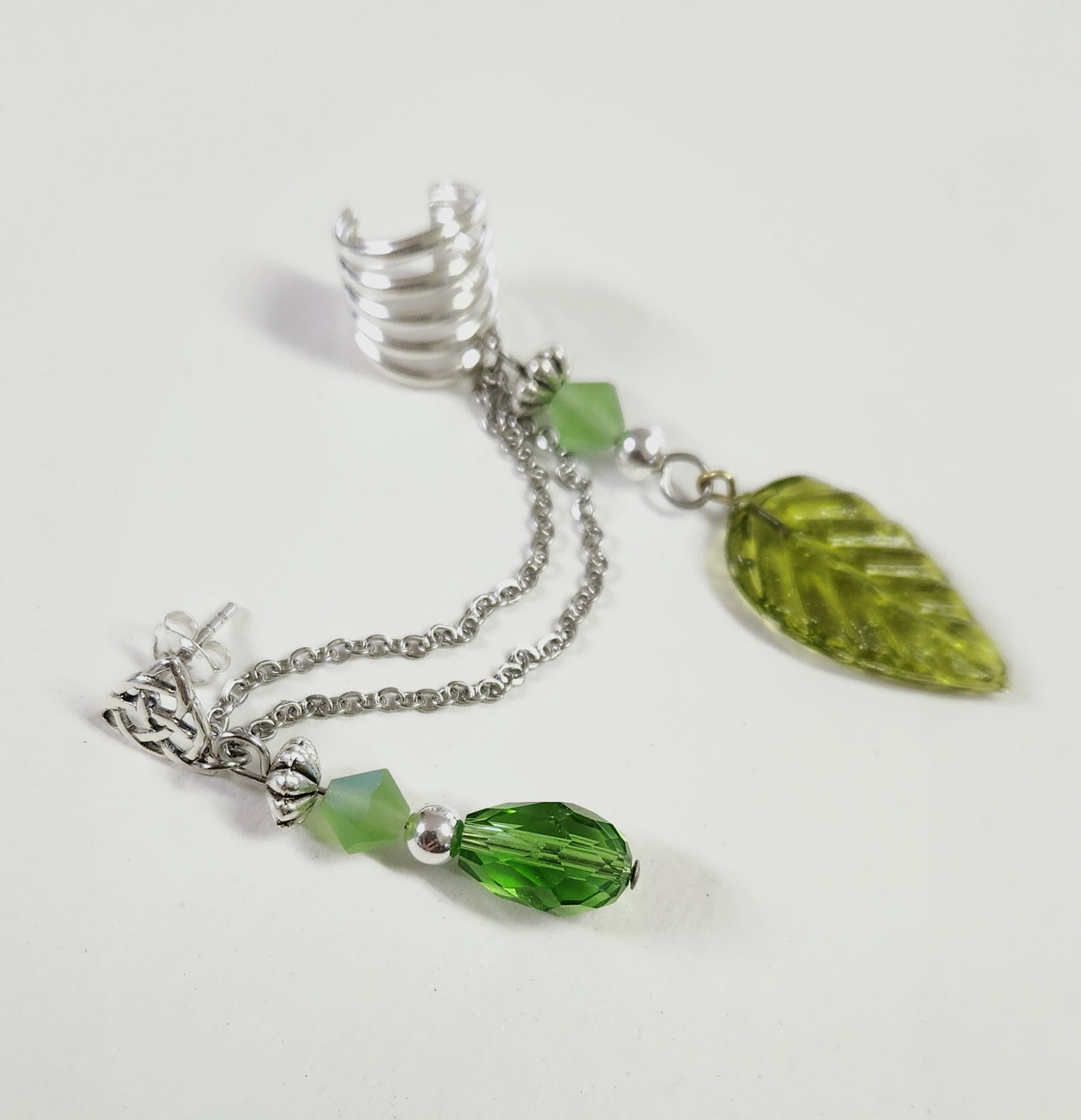 These fancy style cuffs feature a sterling silver cuff connected via a pair of chains to a sterling silver post. The dangle from the post and cuff features a green glass leaf with silver toned beads.