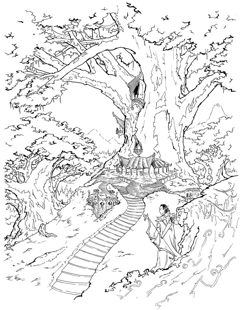 Michael asked me to illustrate the forested home of Kaelnor for his first Sagaborn book. I envisioned a blending of Rivendell and Lothlorien from The Lord of the Rings. I wanted to take the impossibly sized trees of Lothlorien, and blend that with the fanciful, and delicate architecture of Rivendell. I submitted my sketches, got them approved, and finished the art.
